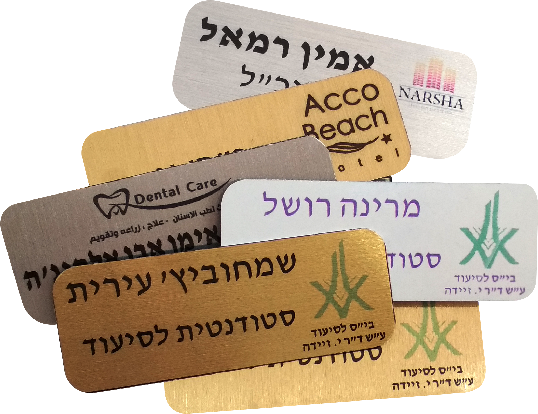הפקה של תגי שם בגדלים שונים בשיטת חריטה או סובלימציה, עם סגירה מגנטית או סיכה, לפי דרישת הלקוח.